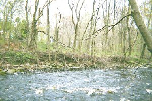 Most of the remaining segment flows quickly through predominately red maple forested banks. After the stream passes under the road, there are large sandy